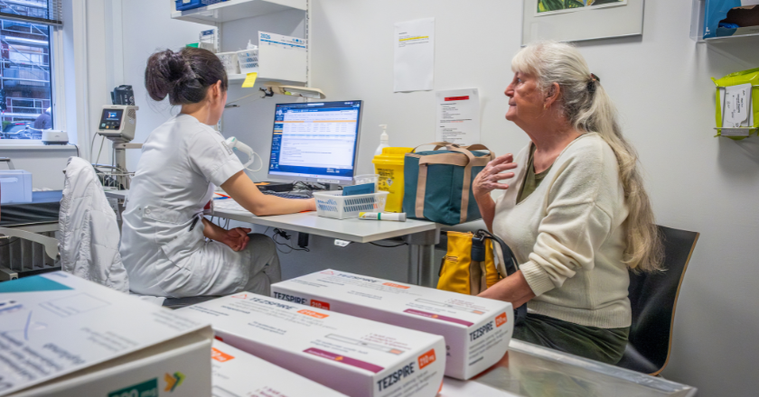 Annemarie er forbi ambulatoriet for at hente sin medicin. Hun har besluttet sig for at skifte fra sprøjte til at bruge en pen, som klarer opgaven med et enkelt tryk. Foto: Astma-Allergi Danmark